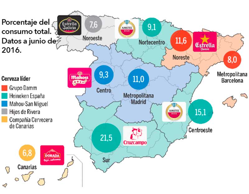La regionalidad sigue predominando y las cervezas locales, Estrella Galicia, de Hijos de Rivera, y Dorada, de Compañía Cervecera de Canarias, dominan en Galicia y Canarias respectivamente. Mientras las Islas Canarias se quedan en un 6,8% del consumo total, Galicia, Asturias y León acumulan el 7,6% del mercado.