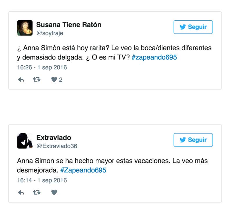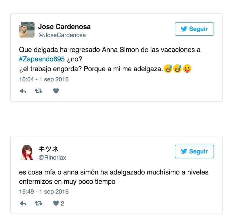 Anna Simón ha vuelto a ‘Zapeando’ tras unas semanas de vacaciones y algunos seguidores de Twitter no han tardado ni un día en lanzarse a decir que está demasiado delgada. Está claro que las críticas con el peso, ya sea mucho o poco, están por desgracia a la orden del día: