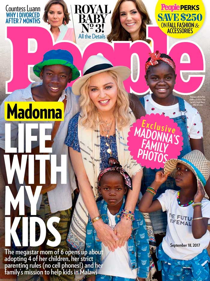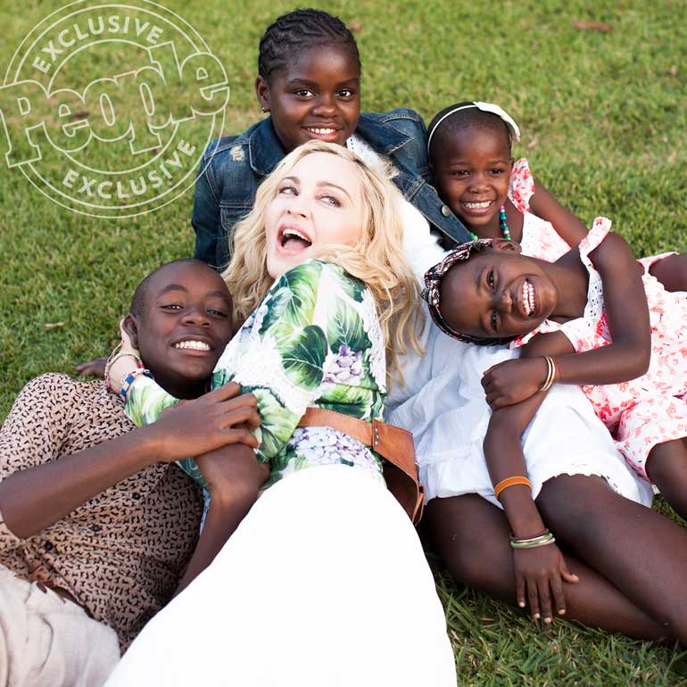 Madonna ha sorprendido hoy con una portada en la revista People posando con sus cuatro hijos adoptados, David Banda, Mercy, Esther y Estella, que se unen a sus dos hijos biológicos: Lola y Rocco. Los cuatro los adoptó en Malawi, país africano donde Madonna tiene una ONG que construye hospitales, colegios y casas para niños huérfanos.