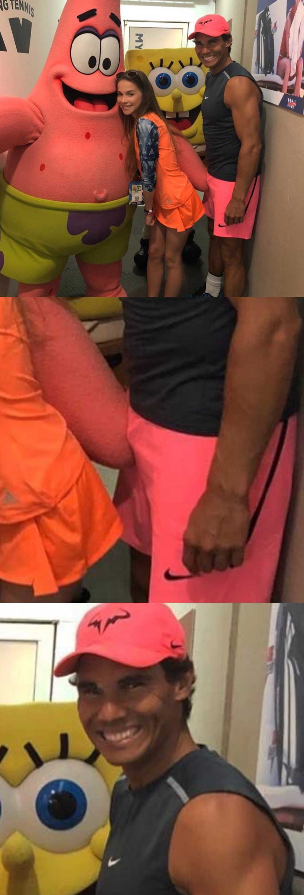 La foto de Rafa Nadal junto a Bob Esponja y Patricio se ha hecho viral por varios motivos. El primero es la mano de Patricio, que parece confirmar ese refrán de Las Manos van al Pan.