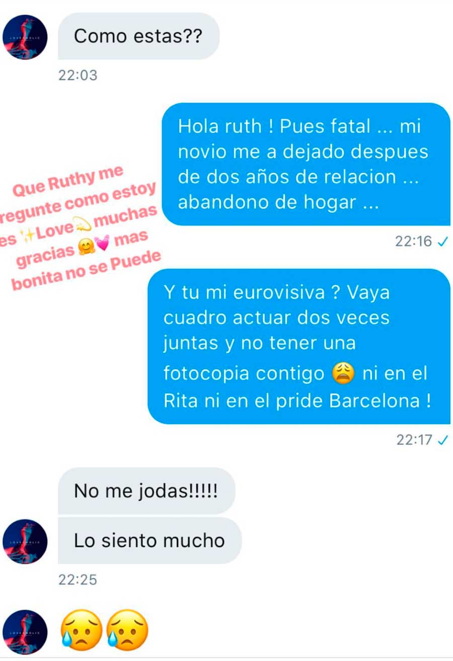 Pues bien, ha sido la propia Pelopony la que ha aclarado la situación publicando una conversación con Ruth Lorenzo a través de la red social.