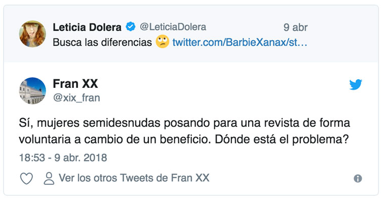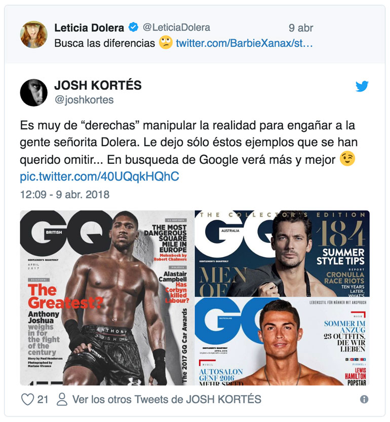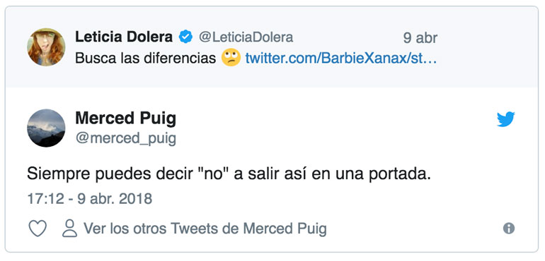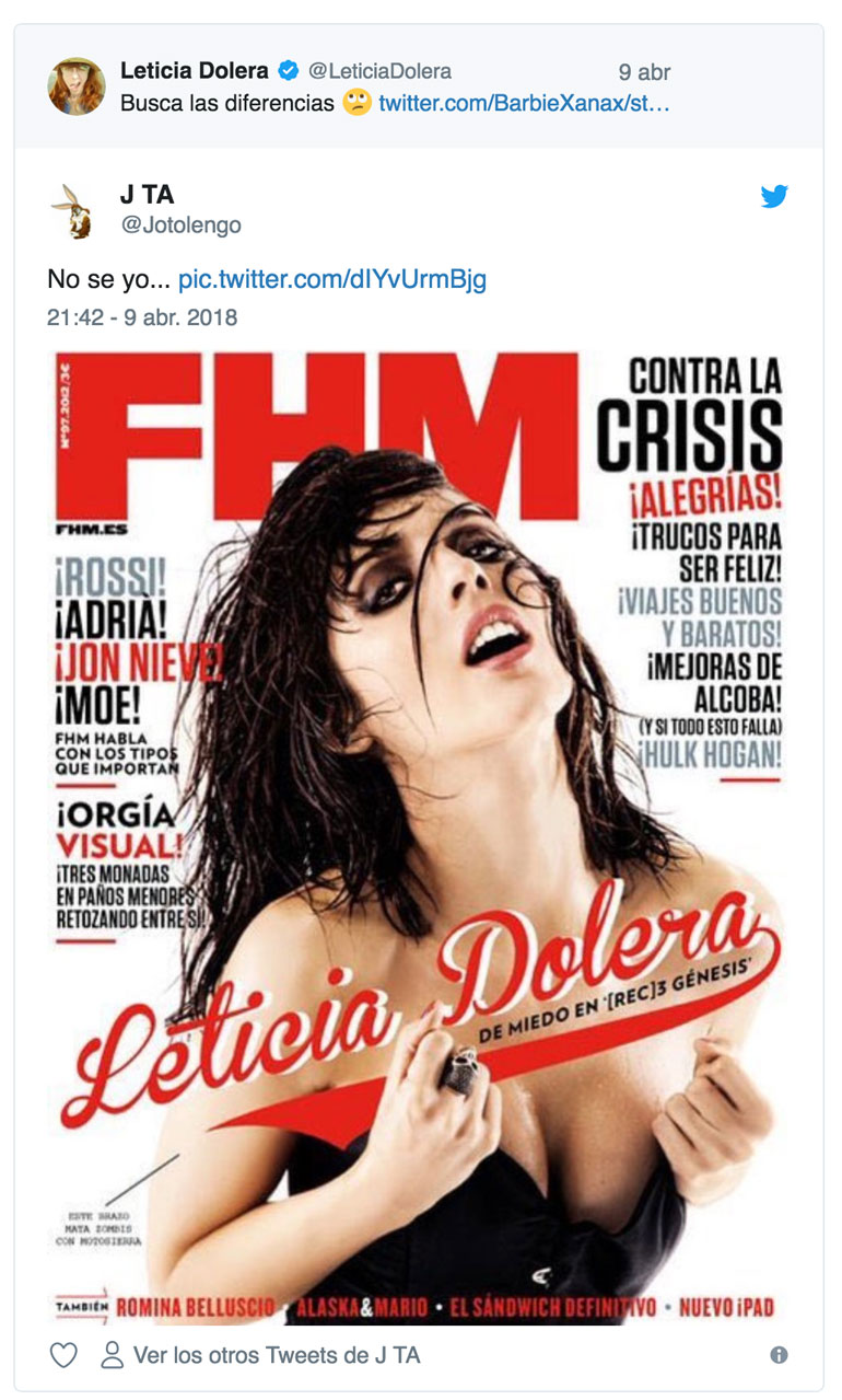 Leticia Dolera, abanderada del nuevo feminismo, ha publicado un ‘tuit’ en el que hablaba de las diferencias entre las portadas protagonizadas por hombres y por mujeres. Lo que pasa es que parece que se le ha olvidado que ella misma ha protagonizado portadas de ese tipo, tal y como le han recordado con otro ‘tuit’.