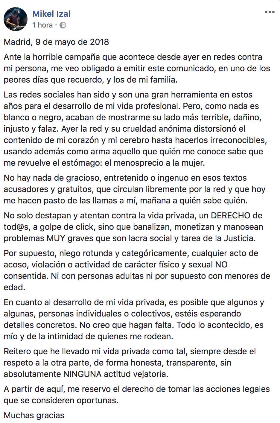 Mikel Izal, líder de la banda Izal, que está de gira por toda España en estos momentos, ha emitido un comunicado para romper su silencio acerca de las acusaciones que se han hecho en redes sociales hacia él.